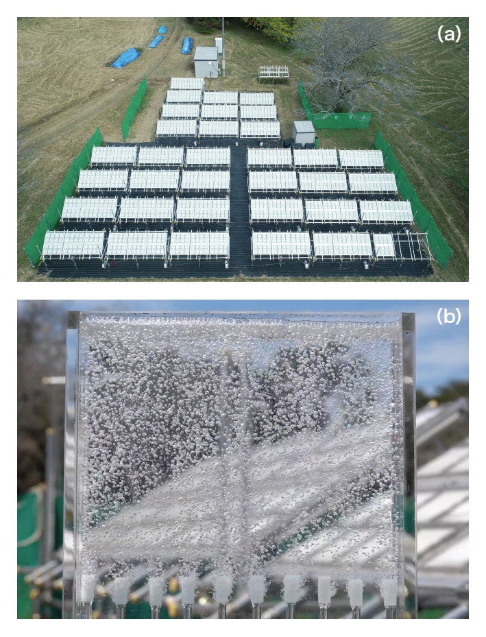 さて、この研究は、太陽電池のようなp-n 接合のような内部組み込み電界を導入しなくても、数百 nm の微粒子光触媒ではほぼ100%の量子効率でエネルギー変換ができるという点で非常に重要である。さらに、この高効率光触媒をガラス基板の上にナノシリカを用いて、平面上に固定化した光触媒シートおよびその上に蒸留水(電解質無し)の100 μm の層をもつ水分解パネルを用いると、水が効率的に分解することが分かった。この水分解パネルは、25 cm x 25 cm の大きさであるが、これを1600枚用いて、100 m2の受光面積を持ち、かつ水素分離膜を備えたソーラー水素製造システムを構築し、実際に水素を取り出せることを実証した(図2)2)。