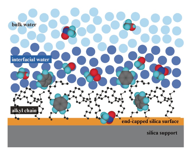 図1 水/C18結合シリカ界面における界面水と溶質の分配挙動