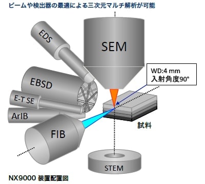 FIBとSEMを直角に配置した三次元解析用加工観察装置です。FIB-SEM、各検出系の最適配置により、高分解能三次元マルチ解析を行うことが出来ます。