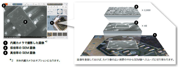 低倍カメラ像やSEM像をクリックすることで試料上を直接移動しているような操作感覚を実現します。 SEM MAP上で取り込んだ画像は自動で貼り付けられ、マップ表示されます。