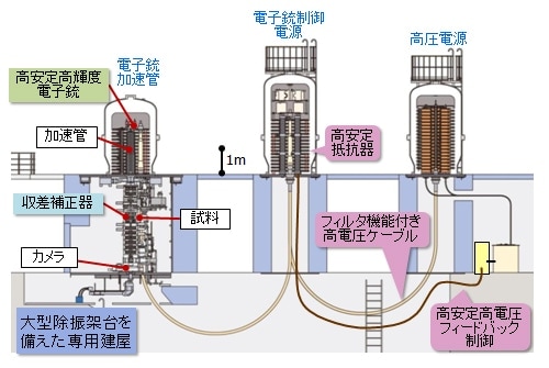 原子分解能・ホログラフィー電子顕微鏡の概要は図1に示す通り、1.2 MV高電圧発生回路、電子銃制御電源、そして電子銃と加速管が収められた三個のタンクを備えている。これらの機器にはマイナス1.2 MVの高電圧が印加されるため、放電抑制ガスであるSF6(六フッ化硫黄)を充填したタンク内に収められている。また、高圧電源から発生する各種ノイズの影響を抑えるため電子顕微鏡本体から離して設置し、その間を高電圧ケーブルで繋ぐ構造となっている。基本構成は、2000年に完成した1 MV超高圧ホログラフィー電子顕微鏡3)を踏襲しているが、今回、分解能を大幅に向上させるために以下の四つの課題を解決した。