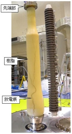 ケーブル先端に高電圧を印加する試験を行ったところ、所定の電圧1.2 MVに達する前に放電が発生し、樹脂の表面に放電痕が残った。