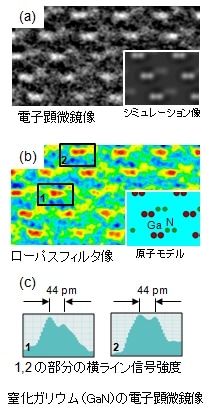 図6 窒化ガリウム(GaN)のGa原子間隔を確認電子顕微鏡の分解能実力を示すために窒化ガリウムの単結晶を用いて、二つのガリウム原子の44 pmの間隔を電子顕微鏡像で捉える事ができた。