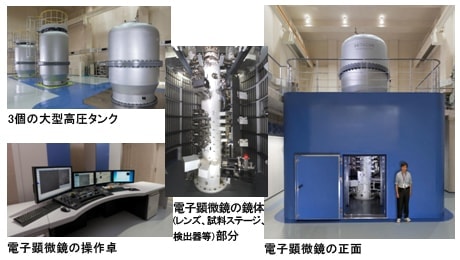 高い安定性を確保するため、高圧電源を電子顕微鏡本体から分離した3タンク方式の1.2 MVの超高圧電子顕微鏡。