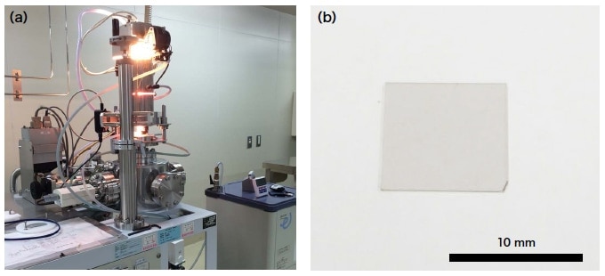 図1 (a)超高速高温赤外線加熱炉の概観、(b)単結晶単層グラフェン試料