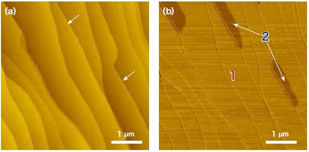 図2に大気中で走査プローブ顕微鏡(SPM)観察(DFMモード)したSiC 上グラフェンの形状像と位相像を示す。試料は1,820°C Ar 600 Torr中でSiC-Si面上にグラフェン作製を行っており、概ね90%程度の表面が単層グラフェンで覆われている。図2(a)の形状像からは基板SiCの結晶構造に由来するステップ-テラス構造のみが見て取れる。図2(b)の位相像には暗い領域が複数観察されこの領域が2層グラフェン領域である。この例ではステップ高さが1 nm以上のステップ端(図2(a)矢印)から下側のテラス上に2層領域が形成されている。