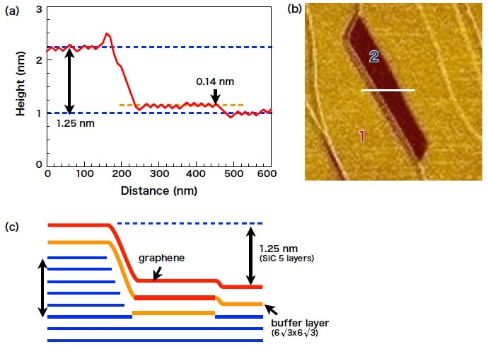 この状況をさらに詳細に検討した結果を図2に示す。図3(a)に示すように2層領域はステップ下側のテラス内に0.14 nmの高さで観察されている。この状況を図示すると図3(c)のようになる。SiC上グラフェンはバッファ層と呼ばれる界面カーボン層(6√3x6 √3構造)の上に成長することが特徴であるが、成長の様式は通常にエピタキシャル成長とは異なり、下側の層が上側の層よりも後に成長する。すなわち、2層部分(図3(b))のバッファ層が既存のバッファ層の下側に成長することによりその部分の元々のバッファ層がグラフェン化する。この事例では、その様子がSPM形状像と位相像から明瞭に判別できる。このような検討を通してグラフェン成長メカニズムの理解が進み高品質化を行うことが出来た。