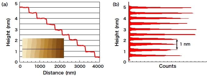 図4 単結晶単層グラフェン表面(a)形状プロファイル、(b)高さヒストグラム