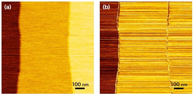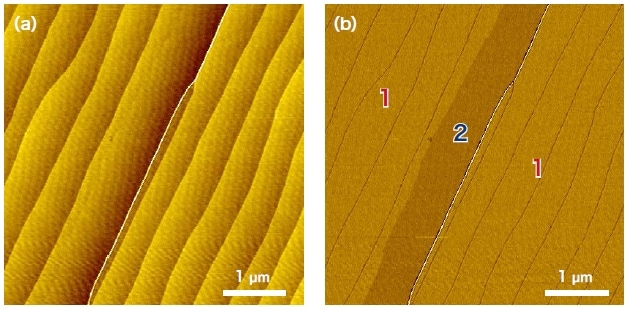 図2 SiC上グラフェンの走査プローブ顕微鏡像(a)形状像、(b)位相像