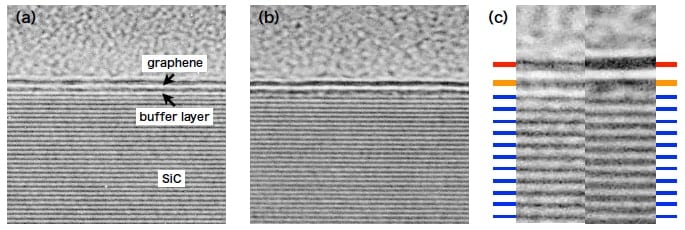 図7 (a), (b)SiC上グラフェン断面TEM像、(c)(a)と(b)の比較