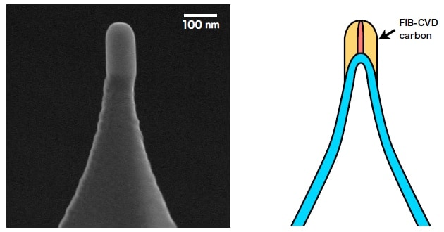 我々のグループではこれまでに走査プローブ顕微鏡用のプローブをFIBを用いて機能化する研究を行ってきている。集積化ナノプローブとして自己検知型プローブ先端部をFIB加工で四探針化したプローブ10)や、FIB化学気相成長法(CVD)により作製したスプリング付ナノカーボンプローブを持つ四探針プローブ11, 12)、30 nm級のギャップ電極を先端部にFIB加工した二端子プローブ13, 14)を作製してきた。図8に最も基本的な構成であるFIB-CVDにより作製したナノカーボンプローブのSEM像(S-5000使用)と概略図を示す。Rhコートの導電性プローブ上にFIB-CVDカーボンを堆積することによりプローブ先端部を機能化してある。ナノカーボン堆積にはSMI3050TB(旧 SII-NT社製)を用いている。FIB-CVDカーボンのナノピラーの中央部コアはGaを多く含むため導電性がある。ナノプローブ先端部の導電性領域の大きさはGaビームプロファイルから10 nm以下であることが期待される。