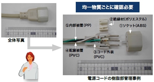 なお、RoHS指令の特徴のひとつとして、化学物質を管理する分母の定義を“Homogenious material means a unit that can not be mechanically disjointed in single materials”と定め、均質物質ごとに規制対象物質の濃度を確認することを原則としている(図3)。