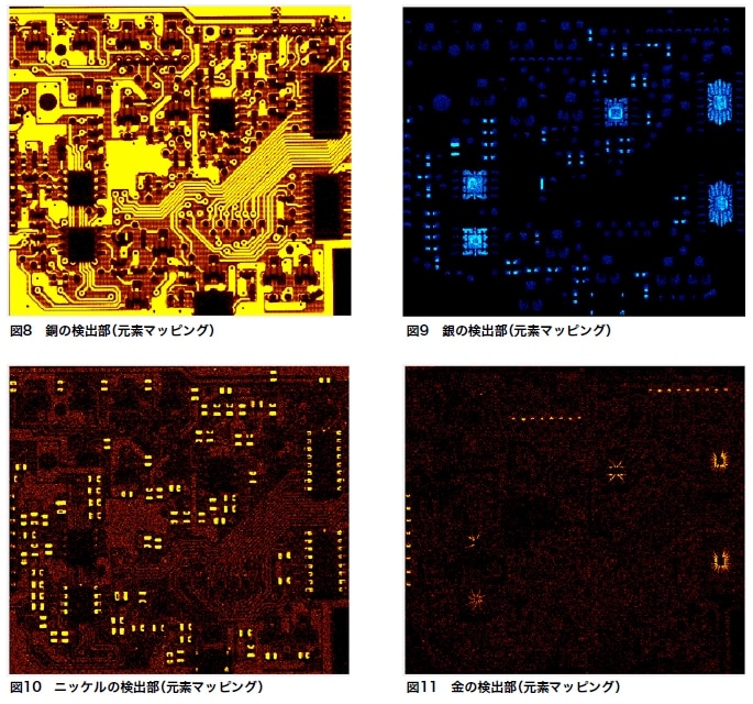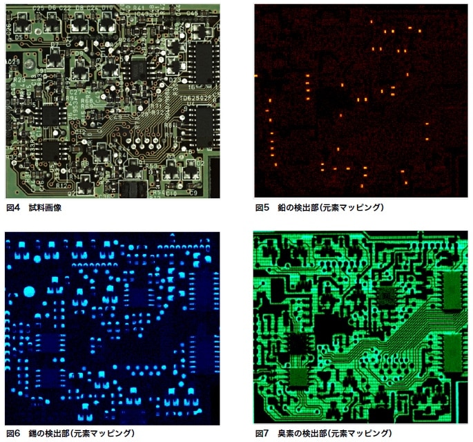 また、効率的なスクリーニングを行う場合、サンプルの測定部分の画像を取り込むと同時に蛍光X線分析をスキャンしながら行い、面情報を得る方法がある。図4~11に測定事例を示す。面情報として、多種の化学物質の分布情報が得られるため、画像と照らし合わせることで、規制物質の存在を確認することができる。また、箇所が特定できることから、除外項目か否かの判断も容易になる。これらの情報は、図12に示すような、元素マッピング機能を備えたエネルギー分散型蛍光X線分析装置により得られる。