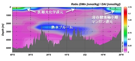 図2 インド洋東経約70度における溶存態マンガン/アルミニウム比の鉛直断面分布