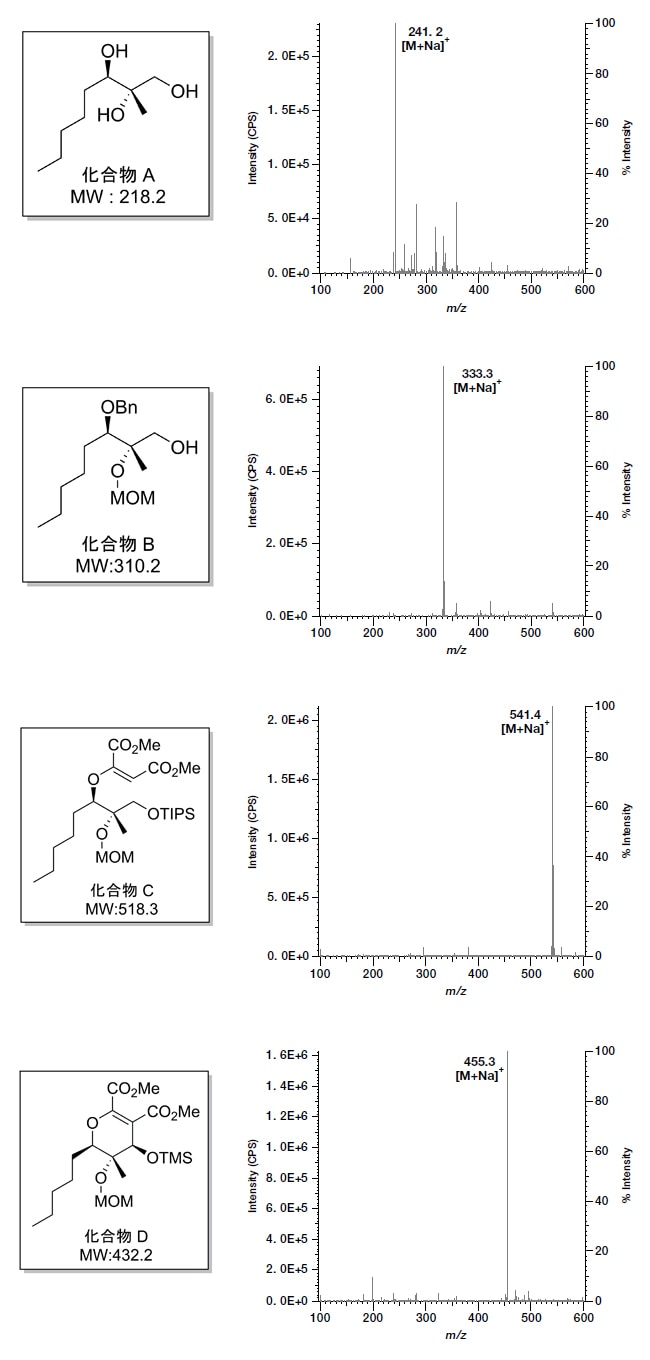 それぞれの化合物A-Dをメタノールで10 ppm に希釈し、ダイレクトに質量検出器で測定した。結果を以下に示す。いずれの化合物についても[M+Na]+としてナトリウム付加型分子イオンが観測された。このように、わずか5分間の測定で化合物の質量情報を確認できた。