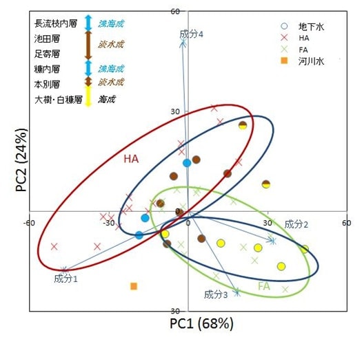 PARAFACによって得られた4成分の和を100%と仮定し各成分の相対割合を用いてPCAを行った。その結果、HAが成分1と4の間に分布するのに対し、FAは成分2と3方向に分布したため、成分1と4が主にHA由来の成分で、成分2と3が主にFA由来の成分であることが示唆された(図3)。また、地下水はHAとFAの2つの系列上に分布していた。HA系列には主に陸成~浅海成層、FA系列には主に海成層から採水した地下水が分布する傾向がみられた。よって、DOMの種類は地層の堆積環境に関係していると考えられた。