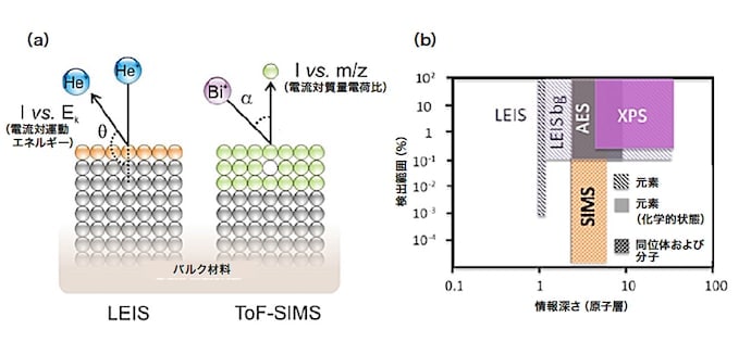 図2 (a)LEIS法および ToF-SIMS法の概略図(b)表面分析方法の検出限界および情報深さ(文献7より転載)