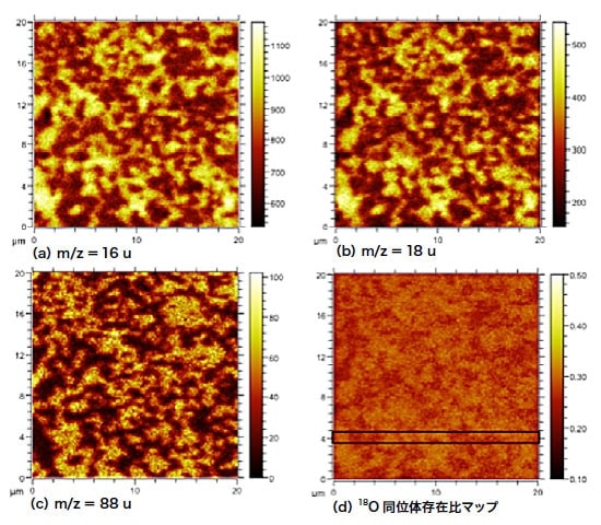 (a)m/z 16 u(16O-)画像 (b)m/z 18 u(18O-)画像 (c)m/z 88 u(LSCF:FeO2-)画像