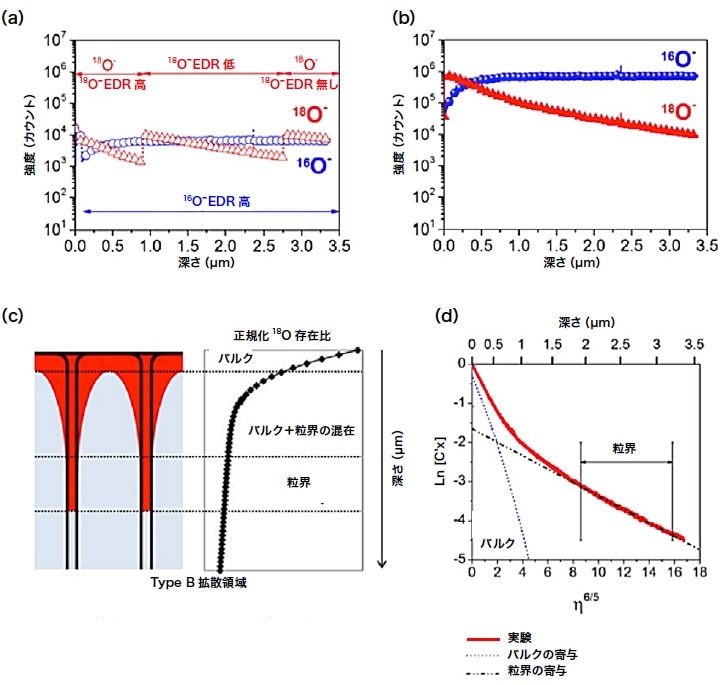 (d)ToF-SIMSプロファイルから推定した正規化18O同位体存在比(Cʼx)プロファイル全体の18O拡散プロファイルに対する以下の2つの異なる寄与が特定されている:バルクを経由する拡散経路と粒界に沿った速い拡散経路(文献19より許可を得て転載)