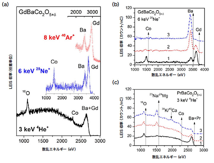 図5 (a)一次イオンビームに 3 keV He+、6 keV Ne+および 8 keV Ar+を使用して得られた、バルク組成GdBaCo2O5+δの多結晶試料研磨したまま)の代表的なLEIS表面スペクトル