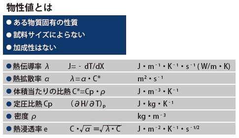 熱物性の中で熱伝導率と熱拡散率の区別がもっとも判りにくい。熱物性の定義としては、比熱容量と熱伝導率が一義的であるが、先にのべたように熱量を直接測定することができない。実際は、熱量は体積当たりの比熱を使って温度に換算され、熱伝導率は熱拡散率に換算されて、温度の拡散方程式として解かれる。熱伝導率が熱量の移動速度とするなら、熱拡散率は温度の移動速度と言うことができる。これらの関係をまとめると以下の式になる。