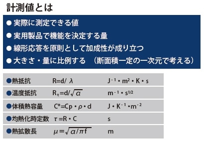 比熱容量や熱伝導率などは、物質の大きさや質量に依存しない固有値であり物性値と呼ばれる概念値である。一方、実際の測定時や実用上は、決められたサイズでの性質が問題となる。たとえば、断熱材では、低い熱伝導率の材料を選択するほかに、材料を厚くすることでも断熱性向上の目的は達成できる。熱抵抗 (その逆数の熱コンダクタンス)などの機能値が現実系では意味を持ってくる。表1は熱物性値の単位を示す。それに対応した熱機能値は表2のようになる。実測では熱容量や熱抵抗を求めて、質量や厚さで規格化して物性値へ変換する。熱量を必要とする融解エンタルピーや熱拡散率は、値が既知の標準物質を必要とする。物性値は理論的考察や材料間の比較には必要であるが、実際の製品設計は機能値で評価が行われていることに留意する必要がある。実用面では、さらにコスト制限が入って来るために、もっとも良い物性値を持つ材料が選択されるとは限らない。通常の電線に銀が使われないことなどがその典型例である。