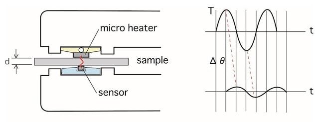 図2は、試料部分の断面模式図であるが、マイクロヒーターと温度センサーを対抗して取り付け、その間に試料を挟む構造となっている。ヒーターへは微弱な正弦波電力が供給され、試料表面に温度波を発生させる。センサーは高感度抵抗型で、微弱シグナルはプリアンプで増幅された後、ディジタルロックインアンプへ導かれる。観測される温度シグナルは、室温などの環境温度と刺激温度波のミックスである。交流測定では、ロックイン増幅の利点でもある指定した周波数成分の変化分のみを抽出して解析できるため、大きなオフセット成分である室温の寄与、ノイズ成分などがキャンセルでき、高感度化が達成できる。実際に与える温度波の振幅は1°C以下と、対流や輻射を極力抑え、また試料に与えるダメージはほとんど無い。またセンサーサイズを0.25×0.5 mmとし、非常に微細な部分の熱拡散率が求まるようになっている。