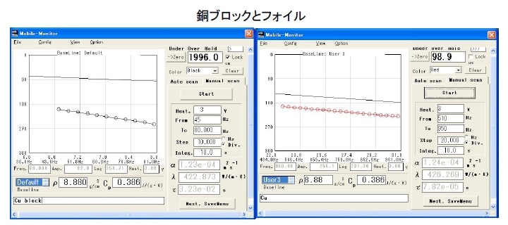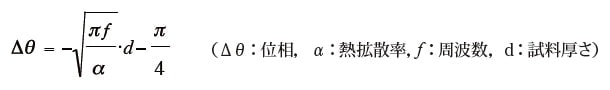 という関係になる。すなわち周波数の平方根に対して位相の遅れをプロットし、別途計測した厚みを用いて熱拡散率が算定できる。本装置では、可動アームに取り付けた差動トランスで逐次試料厚さを測定し、測定中の変形もモニターしている。