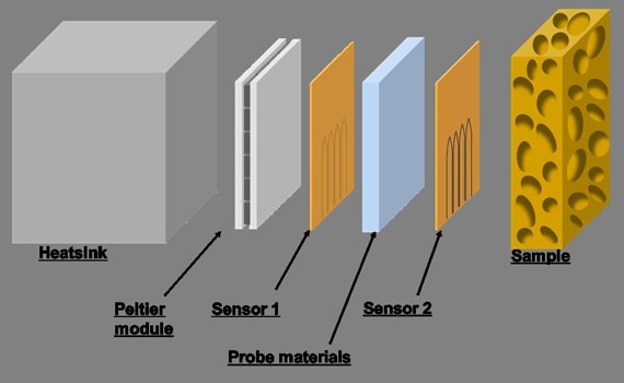 図5は、開発した装置のヒーター・センサーの構成を模式的に示したものである。ヒーターとしてペルチェ素子を用い、一方の面を熱容量の大きなアルミブロックのヒートシンクに密着させている。もう一方は、温度センサー、参照試料(0.5 mm アクリル板など)、温度センサーの順に取り付け、薄い保護フィルム(密着性を向上させる役割を含む)を介して被測定物に圧着させる方式である。この温度波プローブ全体は、30 mm角の面積で積層されているが、温度センサーは、その中心部に面積約1×5 mm2の狭い範囲に5本熱電対を配置しサーモパイルとしてある。センサー周囲はガードヒーターとしての役割を持たせている。ヒーターへの交流を供給する発振器と、温度出力を増幅するロックインアンプ等は前項の方法と同様である。