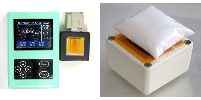 適用対象は、無機物を含む発泡体、粉体ならびにその圧縮体、紙束、布、ポリマーブロック、ゴム、水・油脂などの液体等々、0.02-5 W/mKの材料である。粉体や液体は図6のように袋に入れたまま測定し相互比較することもできる。相対変化であれば、真空断熱材の内部の情報も検討可能である。また参照試料の熱抵抗を変化させることで適用範囲は可変となっているので、伝熱ゴムなどにも適用できる。本方法は、簡便でかつ測定時間が数分以内という画期的な方法である。