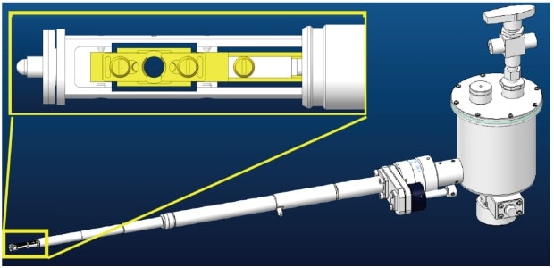 図1 試作クライオトランスファーホルダーのCAD図 左上は先端の試料ホルダー部の拡大