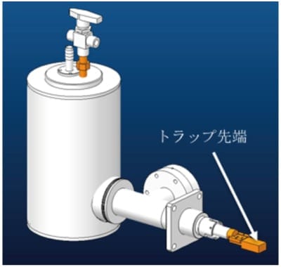 スラシュ化窒素を用いることにより-200℃まで冷却することに成功した。トラップ先端部は試料ホルダーの先端部(試料部分)を包み込むように設計されている。