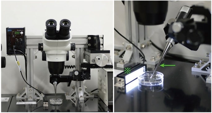図3 試作した細胞膜剥離装置の正面写真(左)と斜めからの近景写真(右):低出力プローブ型超音波発生装置、プローブのポジションコントローラー、実体顕微鏡、水平照明装置から構成されている。矢印は超音波発生用プローブ、アステリスク(※印)は水平照明装置