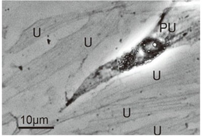 腹側の細胞膜上に細胞骨格(ストレス線維)が載っているのが観察される(U)。PUは部分的に細胞膜が剥離された細胞を示す。