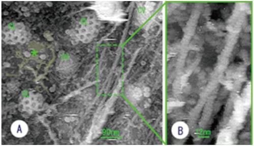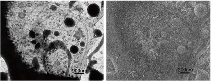 完全に氷包埋されている時(最初)、SEM像は氷で覆われているので平坦であるが、電子線照射によるダメージや温度を上昇させ、氷の一部を昇華させると右図のように構造が現れる。