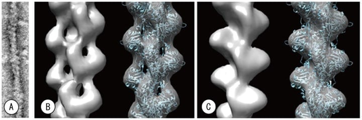 図8 開発機と通常のTEMとの比較。負染色像(A)から、ラセン対称性を考慮した単粒子解析により三次元再構成を行った。(B)開発機30 kV STEM。(C)通常の100 kV TEM。