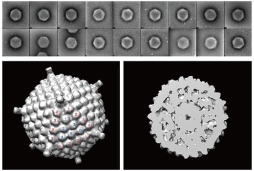 図9 開発機を用いて撮影したアデノウイルス粒子像18個(上部)からの再構成