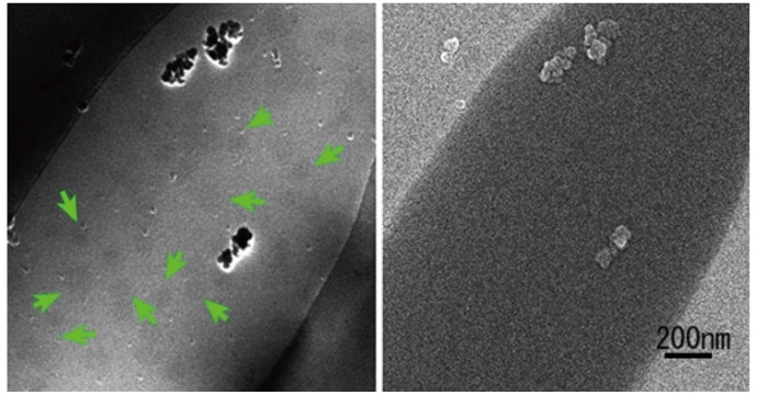 クライオトランスファーホルダーを用いたクライオ電顕は主として生物の凍結試料を観察するために開発されたが、照射ダメージを軽減する効果もあるので材料系でも今後は使用されるだろう。少しややこしいがクライオホルダーを用いたクライオ観察は材料系でも以前から行われていた。トランスファーという用語が使われていないのは電顕に挿入してから、冷却を始めるからである。金属などでは問題にならないが、水を含むものでは結晶状の氷が出来てしまい使い物にならない。そのため、生物材料では急速凍結によりアモルファス氷(非晶質)としてから、凍ったまま電顕に持ち込むのでトランスファーの一語が追加されている。氷(結晶)は液状の物質では重要な問題である。最近、我々は水の中に形成されるナノバブル(100 nm前後の気泡)の観察に成功した(図9)。これは従来のクライオTEMでも観察できると思うが、我々の開発機ではSTEM、SEM同時観察が可能であることから、実際にバブルが水の中に存在することを証明できる。これは新たな利用法であり、今後、化粧品、医薬品、食品、ソフトマテリアル部門の研究所等での本開発機の需要が見込まれる。