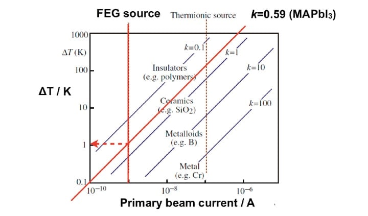 また熱ダメージも気になるところで、図2はビーム電流と試料温度上昇の一般的な関係をプロットしたものである4)。我々の観察試料CH3NH3PbI3(MAPbI3)の熱伝導率5)を外挿してある。グラフの交点から読み取ると、本試料は理論上約1℃/secの速度で温度上昇することが読み取れる。MAPbI3は相転移温度(Tetragonal→Cubic)が55℃付近に存在するため6)、仮に観察時の試料温度が室温25℃とすると相転移まではΔT=30Kで、30秒以内に観察を終えないとダメージとは違う別の議論が始まってしまう。