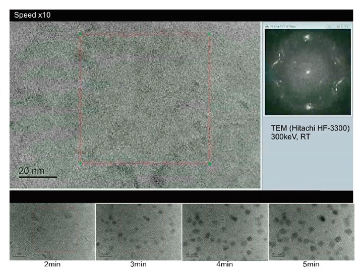 図1は実際にペロブスカイト太陽電池を電界放出形透過電子顕微鏡FE-TEM(Hitachi, HF-3300)で観察時の様子を記録した結果である。観察開始から10秒後の映像では電子線回折像に変化は無いものの、4分後にはスポット状の電子線回折像がハローリング状に変化し、非晶質物質が出現する様子を捉えている。これらはいずれも放射線分解もしくはノックオンによる影響と考えられる。