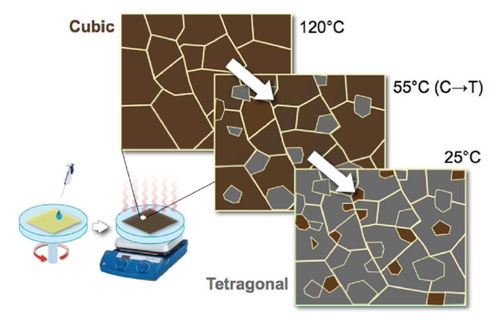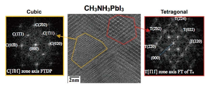 図4は代表的なペロブスカイト太陽電池CH3NH3PbI3薄膜の高解像度TEM観察結果である。予想とは異なり、観察部位によって正方晶(tetragonal)と立方晶(cubic)が混在している部位が見られた。本来、室温では存在しえない高温相のcubicが観察されたのは大きな驚きであるが、本太陽電池は300~500 nmという超薄膜であり、図5に示す通り製造時の都合で加熱状態から室温へ冷却される過程で一部のcubicが凍結された形で取り残された結果と推察される。