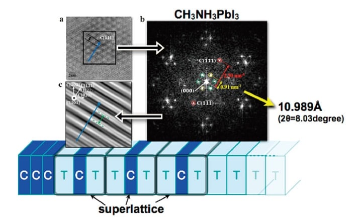 更に観察を進めると、超格子構造も散見された。図6はTEM像(a)電子線回折像(b)およびこれらからフーリエ変換した像(c)の例で、格子の面間距離は10.989Åであることを示している。この大きなd値は本来CH3NH3PbI3ペロブスカイトには存在しないが、紛れもなくペロブスカイト由来のものである。今回のTEM観察から導かれる結果はあくまでも距離情報しかないため以下は推測になるが、tetragonal-cubic-tetragonalの3相が1つの大きな長周期を形成してこのような超格子構造を得たと考えられる。また超格子の存在場所であるが、tetragonalのドメインとcubicドメインを繋ぐ間や下地基板のTiO2相とペロブスカイト層を繋ぐ間に見られ、いずれも僅かな格子ひずみを緩和する形でこうした位置に必然的に存在していると考えられる(図7)。