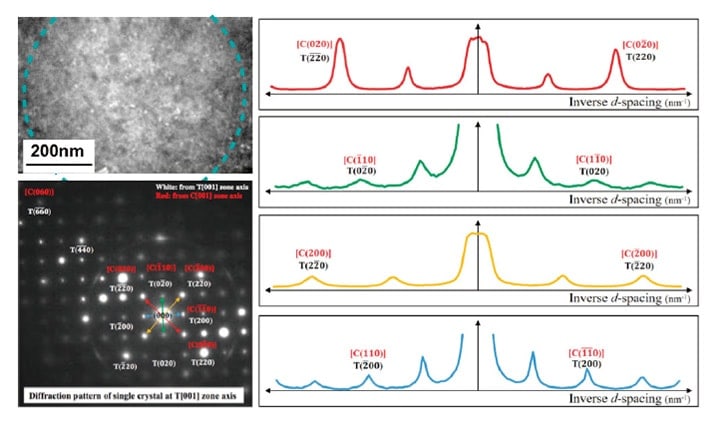 参考までに比較実験として1 mm角の単結晶からFIBで切り出した試料には、こうしたcubic相や超格子構造は確認されなかった。厳密には“無い”ことは証明できないため、低倍率でのTEM観察で試料全体の情報を取り上げ、diffractionの角度の異なる4方向の深さ(濃淡)分析において信号強度の波形が全て中心から対称形であることを確認した。すなわちcubic混在時に見られるピークの偏りやショルダーが無かったことから、tetragonal単一相であると判断した(図8, 9)。