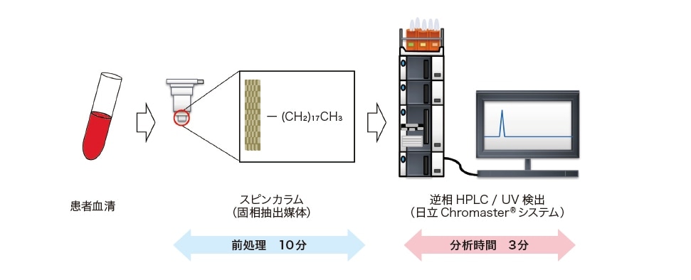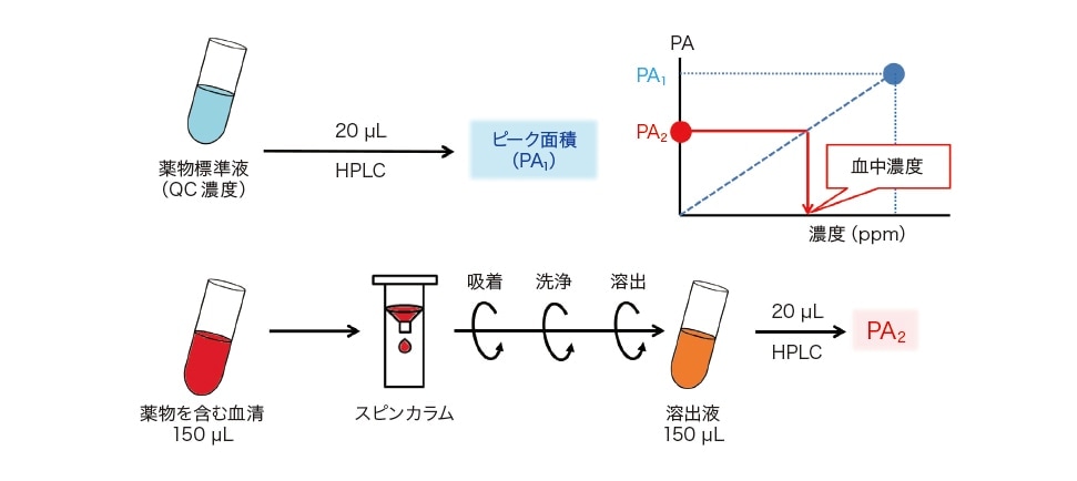HPLC による薬物濃度定量に先立つ前処理手段として、固相抽出(solid-phase extraction, SPE)法を検討した。HPLC装置は、逆相カラム、オートサンプラー、多波長UV(ダイオードアレイ)検出器を備えたChromaster®を使用した。被検薬物の血中濃度定量は以下の手順で行った。1)薬物標準液をHPLC 分析して、一点検量線を作成した。2)薬物を含む血清を遠心スピンカラムでSPE 処理してから、溶出液をHPLC 分析して、前出の検量線から血中濃度を算出した。