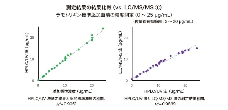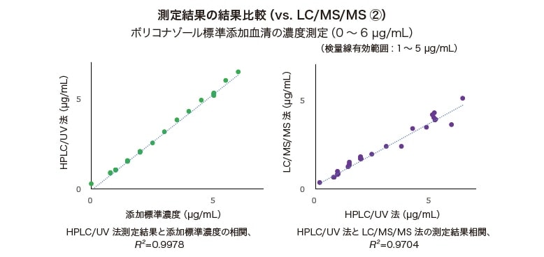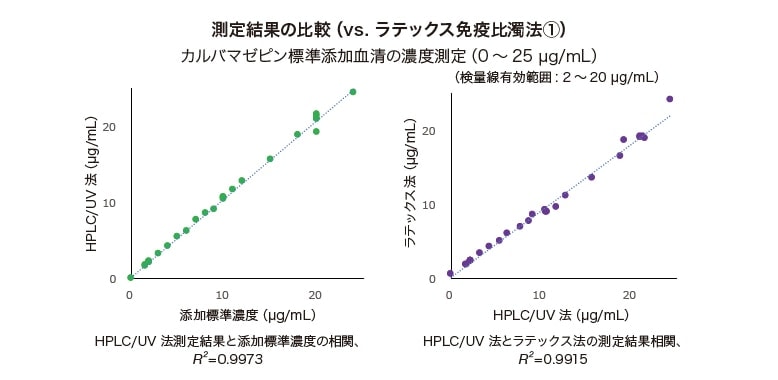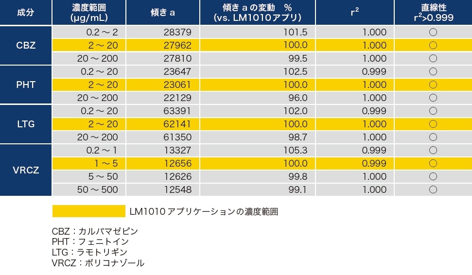 LM1010システムは、分析前のコンディショニング、分析条件の設定、日常的な装置の性能確認などを自動で実施するソフトウェアが搭載されており、臨床検査技師が日常業務と並行して操作した結果、アプリケーション(制御部)はChromaster®と比較して操作しやすいものと評価した(図5)。システムは自動コンディショニング機能とQC(Quality Control)サンプル測定による日常のシステム最適化機能が搭載されており、日常の精度管理を行うのに十分であった。薬物血中濃度測定の1日あたりの検体数や導入コスト等を考慮した結果、前処理に一部手作業を残したが、分析担当者の知識や経験に左右されずに安定した結果が得られた。標準添加血清を用いたカルバマゼピン、フェニトイン、ラモトリギン、ボリコナゾールの血中濃度既知の試料を測定した結果、良好な相関性があった(図6)。また、定量可能な直線性に関するデータを表1に示す。吸光度検出では、一般に、Beer の法則が成り立つのは低濃度領域で、高濃度になると分子間相互作用によって吸光度は濃度に比例しなくなることが知られている。本検討により、高濃度側で吸光度レンジ(2AU)に達してピークの飽和が確認されたが、上記薬剤の血中濃度が中毒域であっても広範囲に直線性が保たれており、一般に臨床で想定される血中濃度範囲では、希釈等の作業の必要はないことが示唆された。