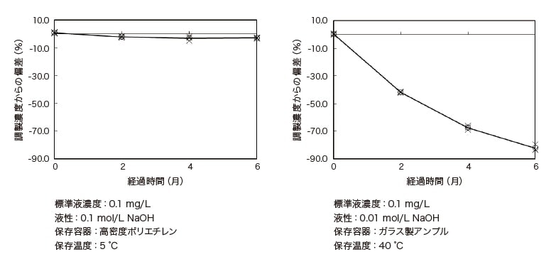 これらの要因は、成分、環境条件などにより複雑に影響しあうため、一般的な程度を示すことは難しい。それぞれの使用方法や保存方法、環境条件などを基に標準液の濃度の保存安定性を確認することが望ましい。