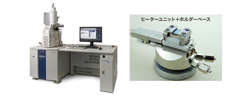 走査電子顕微鏡の中をミニラボ化していくためには、ドローアウト方式の試料交換が必須であり、また高分解能仕様としてのショットキー型電子銃が必要である。このようなニーズに応えているのがSU5000走査電子顕微鏡であり、筐体内には、加熱ステージをはじめとして様々なステージが装着できる構造になっている。また同装置では、ライブで3次元的に組織が観測できる機能を有しており、従来の立体的な像が得やすい走査電子顕微鏡の機能をさらに拡充した仕様となっている。同装置の写真と、SU5000に装着可能なGatan社製Murano加熱ステージユニットを図1に示す。