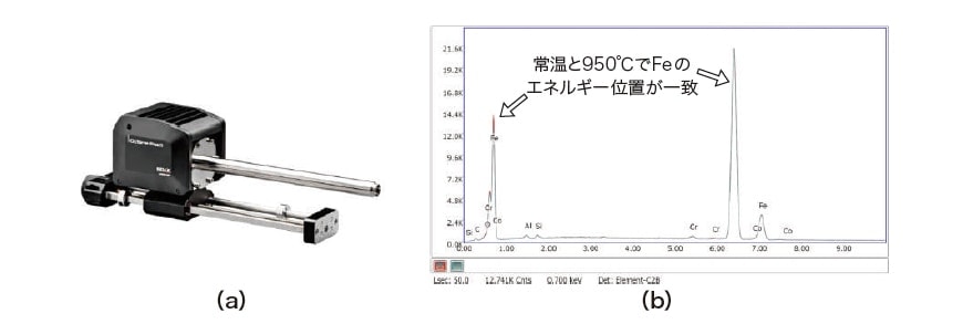 図2 アメテック社製 EDAXシリコンナイトライドSDD検出器の外観(a)と、常温と950℃で計測したFe試料からのEDSプロファイル(b)