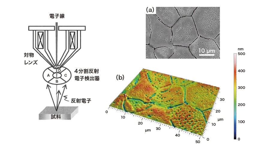 図5 4分割反射電子検出器の模式図と2次電子像(a)と画像再構築された凹凸状態を示す鳥瞰図(b)