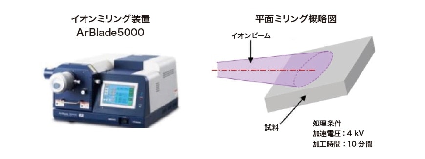 図7 イオンミリング装置と平面ミリング条件の概略図